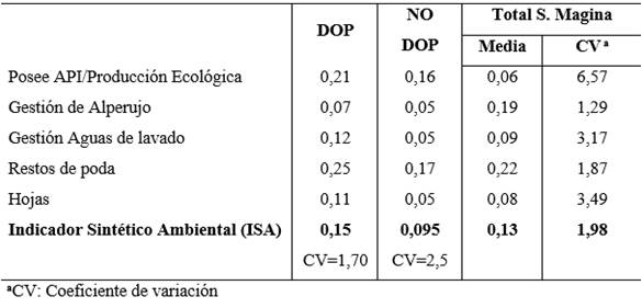 El Indicador Sintético Ambiental (ISA)20 de la Comarca arroja un valor de 0,13 muy inferior al registrado por el ISI y mayor dispersión de resultados (CV = 1,98), con una fiabilidad aceptable. No se presentan diferencias estadísticamente significativas en el ISA considerando el tamaño de las almazaras, así como entre las que poseen DOP (ISA = 0,15) respecto de las que no pertenecen al CR (ISA = 0,095). No obstante, en este último grupo se presenta mayor dispersión de resultados con un CV =2,50 frente a un CV=1,70 en el caso de las que tienen DOP (Tabla 4). Una explicación de estos resultados puede hallarse en el hecho que, a diferencia de la actividad interprofesional de larga data que ha venido ejerciendo el CR en torno a la difusión de buenas prácticas en la obtención de aceite, no ha existido una organización interprofesional similar en temas ambientales.