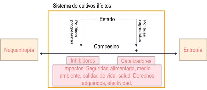 La consolidación de dichas políticas tiende a la entropía del sistema, pero no se refiere esto a que el sistema de cultivos ilícitos caiga o desaparezca, se refiere a que las implicaciones sobre el medio ambiente, los modos de vida, la seguridad alimentaria, la economía campesina, son negativas (ver figura 4).