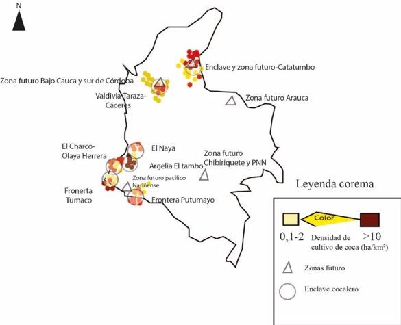 Las zonas futuro se traslapan con muchos territorios donde hay cultivos de uso ilícito, el pacífico nariñense, el Catatumbo, el bajo Cauca, el sur de Córdoba, Arauca y Chibiriquete ( ver figura 2). Su objetivo se centra en intervenir militarmente los territorios con cultivos de coca, detener la deforestación, encaminando la sustitución de cultivos. Pese a sus principios y objetivos, las zonas futuro, carecen de fuertes componentes de participación comunitaria, y al ser directrices desde el Ministerio de Defensa y la Presidencia de la República tienen conflictos con los procesos de autonomía territorial.