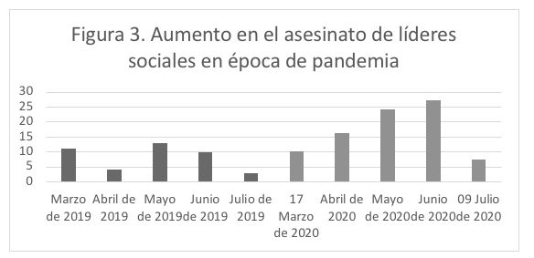 Desde que se declaró el Estado de Emergencia Económica Social y Ecológica en el país mediante Decreto 417 del 17 de marzo de 2020, han asesinado a 84 líderes sociales, con corte al 10 de julio de 2020 (INDEPAZ, 2020a), las cifras preocupan porque existe un aumento en un 110% [4] en el asesinato de líderes sociales con respecto a las cifras del año anterior (ver figura 3).
