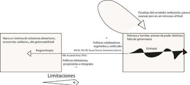 Del mismo modo, se considerará el concepto de Rosa (1964) sobre una política regresista, la cual se define como una política que retrocede, derivada de la acción mecánica de ?regresar? a la luz de los ojos de quien lo considere así. Para el caso, será una política regresista dentro de la visión y el discurso del campesinado entrevistado, aquella que retome características estructurales evidenciables mediante datos de políticas que fracasaron en el pasado, es decir, una política que además de su inefectividad, conduce al camino de la entropía sobre el discurso campesino. Por el contrario, serán inhibidoras y progresistas, aquellas que demuestren efectividad en los datos y adicionalmente la visión del campesinado sea positiva.