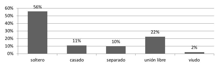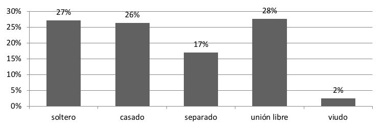 Conforme al estado civil encontramos algunas diferencias significativas. Por un lado, en el caso del CEREPRESO Topo Chico de Monterrey (Figura 17) más de la mitad de las personas encuestadas?54%?manifestaron estar en una relación; 28% de ellos en unión libre y 26% de ellos casados. Mientras que el 17% manifestó estar separado y el 2% viudo. Lo que nos indica que casi el 20% de ellos estuvieron en una relación en el pasado, la cual terminó solo en el caso del 2% por muerte de la pareja. Solo el 27% se manifestaron solteros.