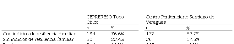 La categorización de los grupos se realizó para las muestras de cada centro penitenciario de estudio de manera independiente, obteniendo como resultado una distribución de aproximadamente tres cuartas partes de la muestra de cada centro penitenciaron con favorecimiento de la resiliencia familiar, tal como se muestra en la siguiente tabla: