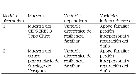 De acuerdo con esta categorización, se definieron dos modelos alternativos de regresión logística binaria múltiple, uno para cada muestra de los centros penitenciarios dónde se realizó el estudio de manera independiente, con la finalidad de conocer diferencias y puntos en común entre las dos muestras.