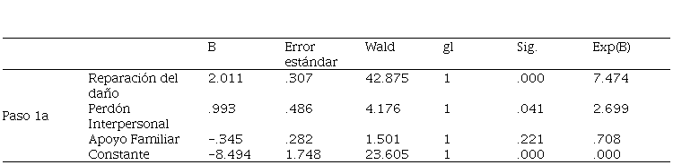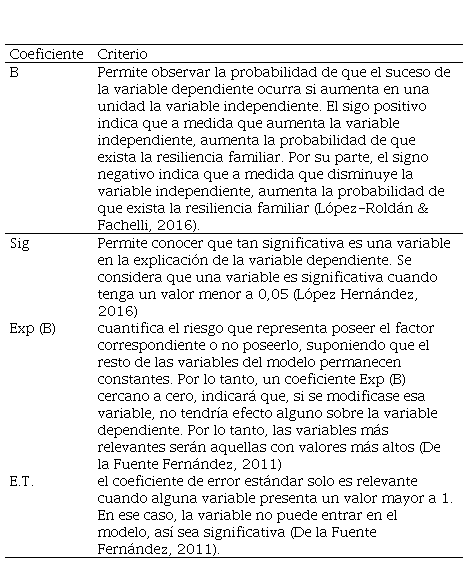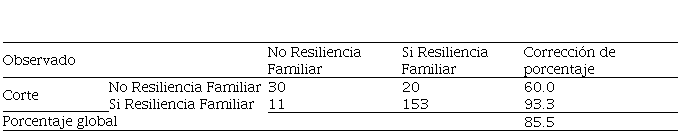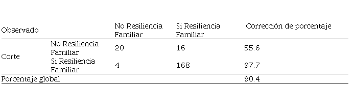 Los resultados de los coeficientes de la ecuación de regresión logística binaria múltiple permitieron identificar quiénes y cuántos individuos pertenecían al grupo que sí presentaba indicios de resiliencia familiar y quiénes y cuántos individuos pertenecían al grupo que no presentaba indicios de resiliencia familiar de acuerdo con las variables independientes. El cruce con la categorización inicial, la cual consideraba exclusivamente a la variable dependiente, permitió conocer qué porcentaje de los casos estaban correctamente clasificados (Oviedo & Campo-Arias, 2005).