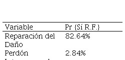 Por su parte, la probabilidad de impacto del perdón interpersonal en la resiliencia familiar de las PPL registró porcentajes del 2.84% en la muestra mexicana y 0.17% en la muestra panameña. Por tanto, se puede concluir que, si bien el perdón interpersonal es un elemento de la justicia restaurativa presente en la resiliencia familiar de las PPL, no es un elemento relevante en que esta suceda o no.