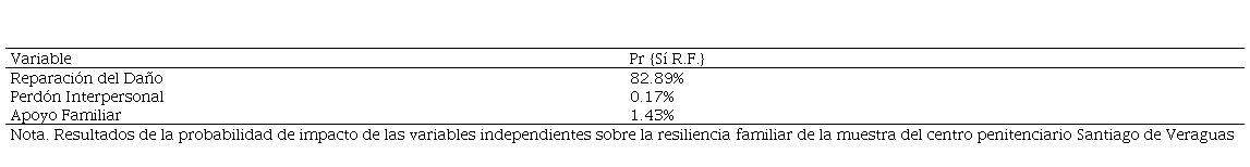 En términos probabilísticos es 82.89% probable que los internos del centro penitenciario de Santiago de Veraguas que se manifiesten dispuestos a reparar el daño causado por su ingreso en prisión a sus familiares tengan mayor éxito en su resiliencia familiar, siendo la reparación del daño la variable más significativa.