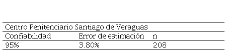 Para definir la muestra se utilizó el método de Muestreo Aleatorio Simple?con un margen de error del 5% y una confiabilidad del 95%?dando como resultado una muestra (n) de 167 PPL para el CEPRERESO Topo Chico y una muestra (n) de 134 para el centro penitenciario de Santiago de Veraguas, obtenidas a través de la siguiente fórmula: