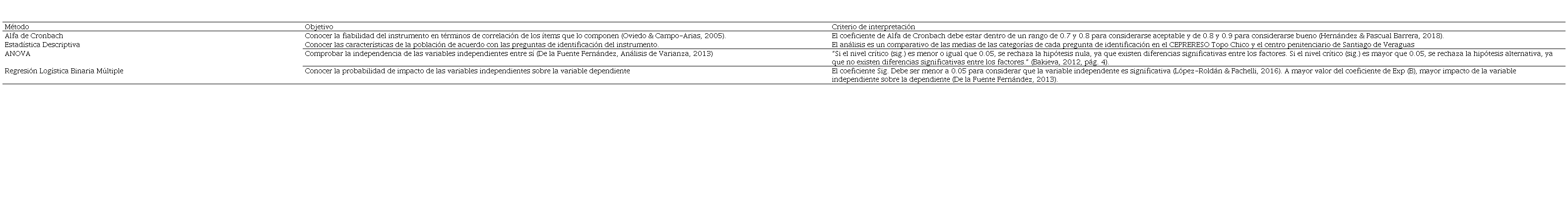 Para poder conocer la probabilidad de impacto de los elementos de la justicia restaurativa en la existencia de la resiliencia familiar de la PPL y jerarquizarlos según su importancia, se realizó un estudio cuantitativo explicativo (Müggenburg Rodríguez & Pérez Cabrera, 2007) en el CEPRERESO Topo Chico de Monterrey. Para determinar si el fenómeno estudiado en la muestra mexicana se repite en otro contexto latinoamericano que comparte la misma problemática, el instrumento cuantitativo explicativo también fue desplegado en el Centro Penitenciario de Santiago de Veraguas, en Panamá, con la finalidad de poder contrastar la información obtenida en ambas localizaciones [1]. El instrumento de recolección de datos utilizado fue la encuesta tipo escala de Likert y el método principal de análisis para los datos obtenidos fue la regresión logística binaria múltiple.