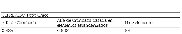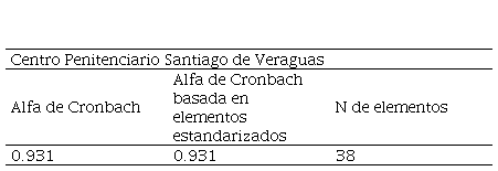 El instrumento fue validado mediante un pilotaje que se aplicó entre el 7 y el 8 de mayo del 2018 a 49 varones PPL en el CEREPRESO Topo Chico, Monterrey. Una vez aplicadas y sistematizadas las encuestas se realizó el análisis de Alpha de Crombach, con el objetivo de conocer la fiabilidad y consistencia interna del instrumento, utilizando el software Startical Product and Service Solutions?en adelante SPSS?, cuyo resultado se expone en la siguiente tabla: