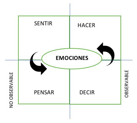 Seguidamente, en la Gráfica No 1, se retoman los postulados e interpretaciones de Suarez, donde resalta la existencia e importancia de las respuestas emocionales dentro de los conflictos interpersonales; para los fines del presente artículo, se permite incluir las emociones en el centro de los cuadrantes, dejando entre ver la gran importancia que tienen las emociones en el accionar de cada uno de los actos relacionados a pensar, sentir, hacer y decir, a tal punto que está en una constante interacción entre los no observable y observable.