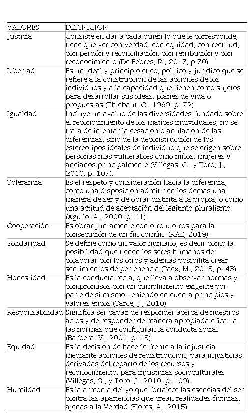 A los valores señalados anteriormente, se le pueden agregar algunos otros como la honestidad, la responsabilidad, la equidad, la humildad y el amor, estos valores inherentes a toda persona se pueden orientar a la verdad, al poder, a la belleza, al dinero, a la abstracción y a las trascendencias religiosas. Vinculados a la ética y a la moral, cada uno de estos se torna necesario para que la cultura de paz se convierta en algo práctico. La siguiente tabla incluye la definición de los valores en comento.