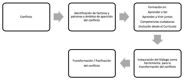 Por tanto es necesario el diseño de planes que desde el currículo garanticen la el diálogo como herramienta para la transformación de los conflictos entre los estudiantes, para ello es necesario reflexionar con toda la comunidad educativa sobre los conflictos predominantes en estas comunidades, así como los patrones que los sustentan. Al hablar de implementar el diálogo también implica formar en la identificación de las emociones, la comunicación y la gestión de las éstas, lo que incluye la formación en el ser, el vivir juntos y las competencias ciudadanas, de modo que se cumpla el siguiente ciclo: