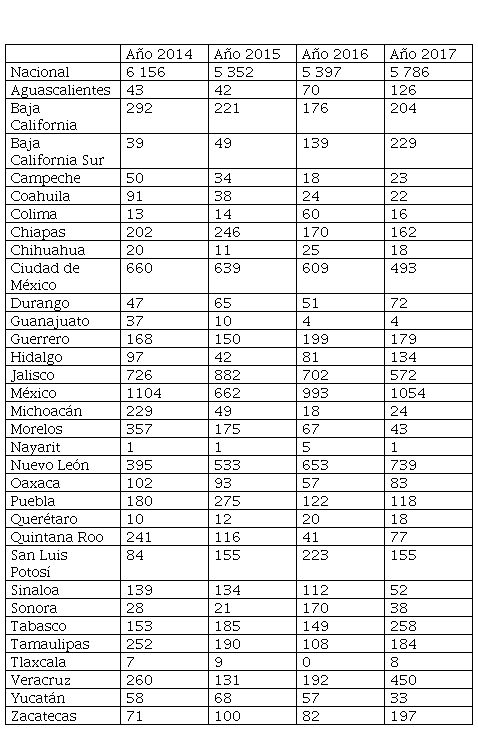 En el periodo del año 2014 al 2017, los Estados de Aguascalientes, Baja California Sur, Durango, Guerrero, Hidalgo, Nuevo León, San Luis Potosí, Tabasco, Veracruz y Zacatecas registraron un aumento en el número de víctimas directas registradas en averiguaciones previas y carpetas de investigación por el delito de extorsión, pese a la creación de protocolos para prevenir la consumación del delito de extorsión. El Sistema Nacional de Seguridad Pública ha publicado que a nivel nacional, durante el año 2017, las Entidades Federativas de la República Mexicana registraron un total de 5 786 carpetas de investigación por este delito, resultando los Estados con mayor incidencia, en primer lugar, el Estado de México con 1 054 casos; en segundo lugar Nuevo León con 739 casos; en tercer lugar Jalisco con 572 casos; en cuarto lugar se ubica la Ciudad de México con 493 casos; y, en quinto lugar, Veracruz con 450 casos. Dichos resultados se observan en la siguiente tabla:
