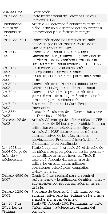 Desde principios de los años 90 existen antecedentes normativos a nivel nacional en Colombia, introduciendo la situación de los y las menores excombatientes en leyes y políticas públicas, orientadas en el marco normativo internacional (Defensoría del pueblo, 2014, p.75). A continuación, se encuentran reflejados algunos de estos desarrollos legislativos en Colombia y su vinculación al ámbito internacional desde la perspectiva de la infancia.
