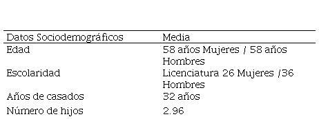 En el presente apartado se describen los resultados de 150 encuestas aplicadas a 75 matrimonios longevos de la ciudad de Saltillo, Coahuila. Se representan los porcentajes por ítem, las respuestas se encuentran divididas por mujeres y hombres. Los datos sociodemográficos de los sujetos encuestados arrojan una media en mujeres y hombres de 58 años de edad (tabla 1), con una escolaridad muy diversa, en donde las frecuencias más agrupadas se encuentran en el nivel de licenciatura para ambos, siendo más los hombres con estudios universitarios. El matrimonio promedio tiene 32 años de casados, 2.96 hijos por pareja y se encuentran dentro de un estatus socioeconómico medio.