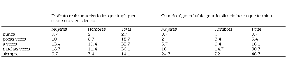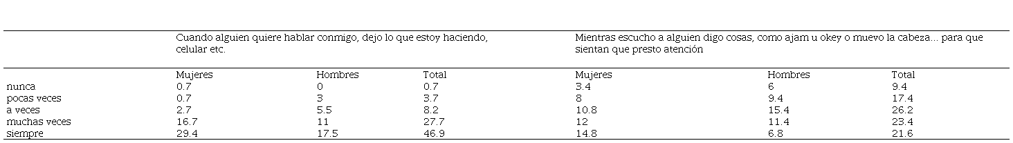 Se realizó el mismo análisis de frecuencias por sexo y totales (tabla 2), representado en porcentajes del aparatado de escucha activa, el cual se encuentra formado de dos indicadores, el primero denominado silencio que consta de tres ítems, el segundo indicador llamado atención y comprensión compuesto por cuatro ítems. Sobre el primer indicador se preguntó referente al tema de disfrutar realizar actividades que impliquen estar solo y en silencio, a lo que la mayoría respondió con un 32.7% a veces como opción más frecuente, referente al sexo, las mujeres indicaron la respuesta de muchas veces (18.7%) a diferencia de los hombres que seleccionaron la respuesta de a veces (19.4%). Continuando con el siguiente ítem los encuestados indicaron que siempre (46.7%) cuando alguien habla guardan silencio hasta que termina, sobre el sexo, las mujeres indicaron con un 24.7% la opción de siempre, a diferencia que los hombres con 22% en la misma respuesta.