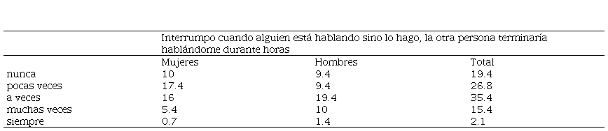 Continuando con el mismo indicador (tabla 3), se preguntó sobre el tema de interrumpir a alguien cuando está hablando, ya que si no se hace, la otra persona terminaría hablando durante horas, a lo que la mayoría respondió con un 35.4% la opción de a veces, en relación al sexo las mujeres señalaron la opción de pocas veces (17.4%) a diferencia de los hombres quienes indicaron la opción de a veces (19.4%).