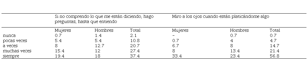 Siguiendo con el mismo indicador (tabla 5), se les pregunto a los sujetos si cuando no comprendían de lo que se les estaba diciendo, hacían preguntas hasta entender, respondiendo con un 33.4% la opción de siempre, las mujeres con un porcentaje de 19.4% a diferencia de los hombres de 18%. En la última pregunta el 56.8% de los encuestados señalaron que siempre miran a los ojos cuando alguien está platicándoles algo, las mujeres con un porcentaje mayor de 33.4% en comparación con 23.4% de los hombres.
