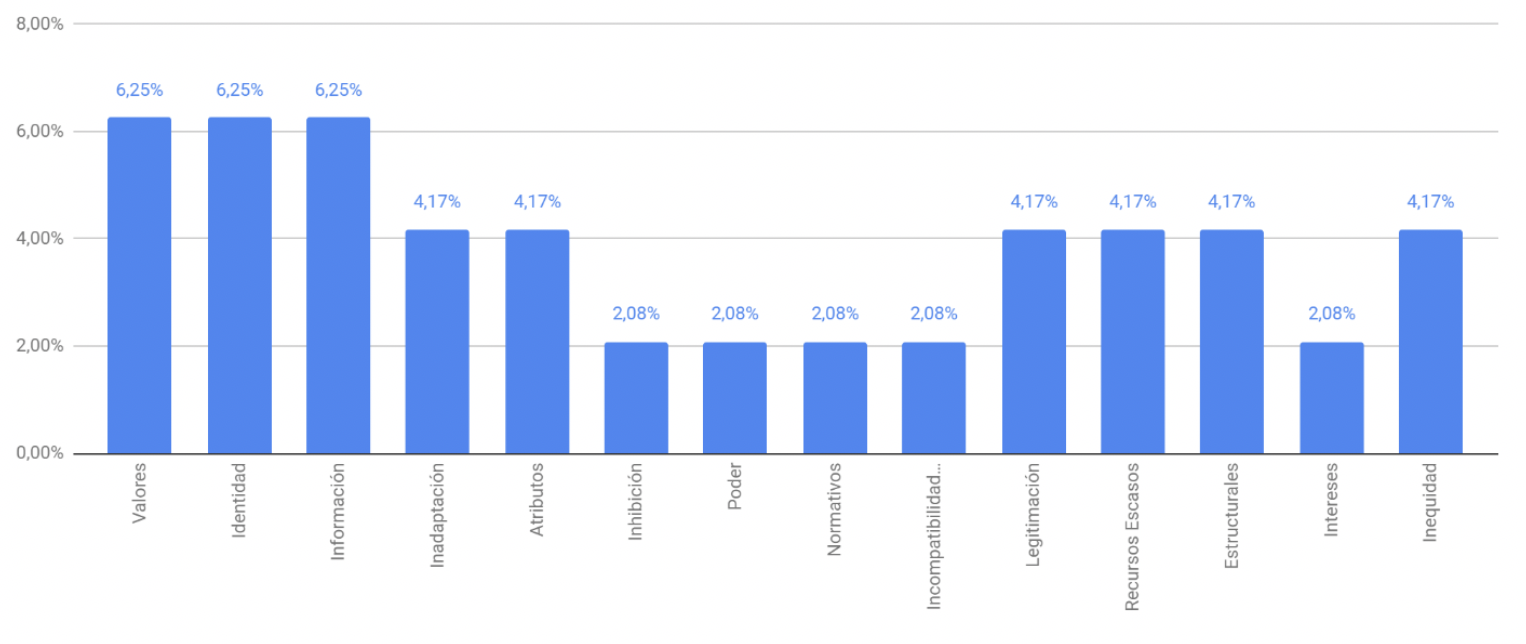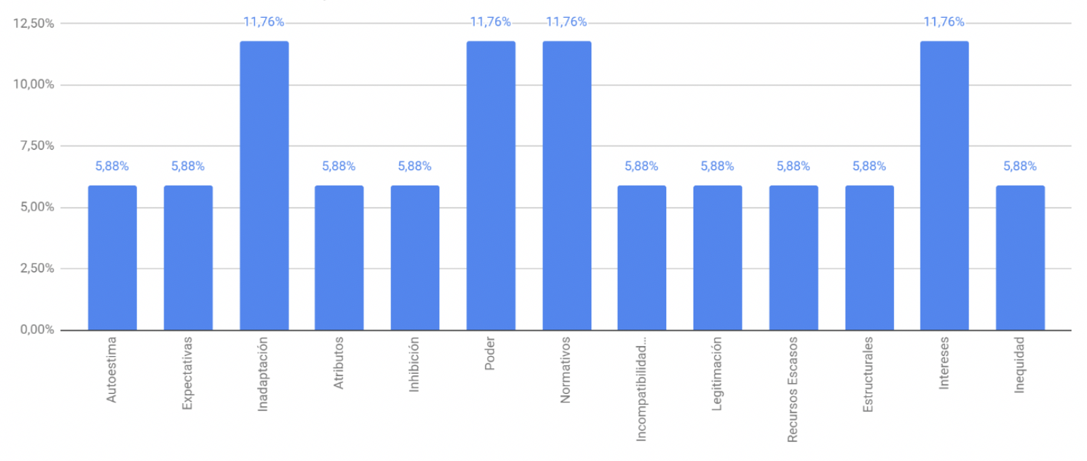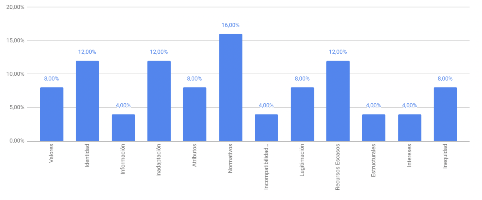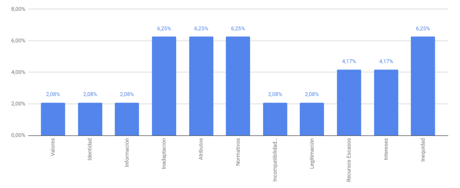 A su vez, se puede inferir una naturalización de las condiciones inicuas que suscitan el conflicto, teniendo en cuenta que inicialmente los sujetos de estudio aceptaron de manera consciente la presencia de conflictos en sus organizaciones, esta última hipótesis debe ahondarse a profundidad en un estadio más avanzado de la investigación y utilizando otros instrumentos de apoyo, que vayan específicamente a determinar si existe o no un proceso de naturalización de determinadas particularidades dentro del mundo de las organizaciones.