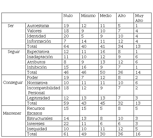 Comprender el conflicto y su naturaleza es por demás complejo, más aún cuando se trata de develar situaciones que pese a ser evidentemente problemáticas, terminan siendo relegadas a la mínima expresión en la escala de prioridades del sujeto laboral. Por tal razón se seleccionó el CAT como instrumento de recolección de información; este es un cuestionario diseñado y estandarizado por Josep Redorta (Redorta, 2011), con la finalidad de identificar dentro de 16 elementos, el patrón y/o fuente del conflicto dominante a fin de ahondar en su naturaleza mediante las etapas de ser, seguir, conseguir y mantener.