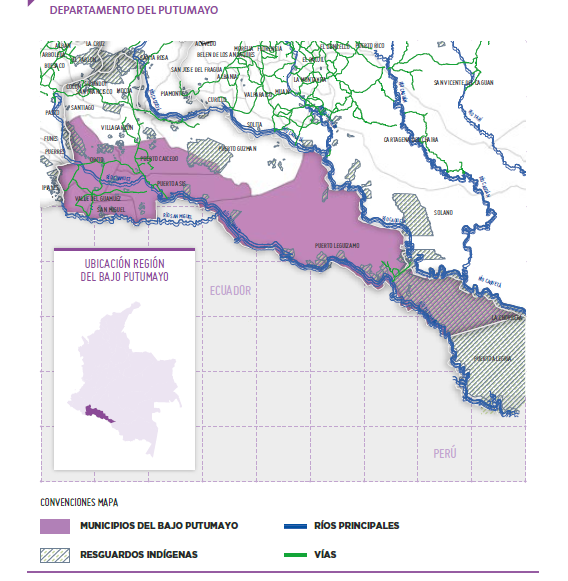 Según Ramírez (2017), el departamento del Putumayo[6] se encuentra ubicado al sur de Colombia, comprende 24.885 km, representan el 2,2% del territorio nacional que abarca desde la cumbre de la cordillera andina, piedemonte y la planicie amazónica, los cauces de los ríos Caquetá, San Miguel y Putumayo. Limita con las repúblicas de Ecuador y Perú, es una región estratégica de desarrollo y constituye un centro mundial de protección dada su riqueza en biodiversidad.
