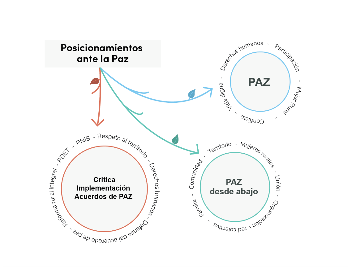 Son posicionamientos diversos, varían según el papel que desempeñan las mujeres. Muestra de ello, son las mujeres que ejercen el liderazgo y defensa del territorio desde las caberas municipales que hacen énfasis en el cumplimiento de los acuerdos de paz, inciden escenarios locales, regionales, nacionales e internacionales.