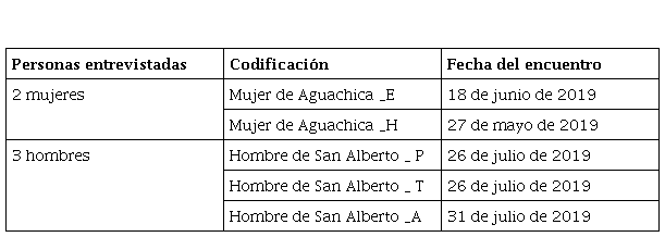Los actores claves del proceso fueron víctimas de desplazamiento, provenientes del departamento del Cesar entre 1992 y 2000 que actualmente residen en el AMB desde la ocurrencia del hecho victimizante. La selección de personas se dio por ser dos de los municipios más afectados del Magdalena Medio por el conflicto social armado. En el presente estudio participaron tres (3) hombres provenientes de San Alberto y dos (2) mujeres de Aguachica. Es de mencionar que el AMB ha sido una ciudad receptora de víctimas de los municipios y departamentos cercanos. Algo en común entre dichas personas fue el actor armado que motivó el desplazamiento forzado, los paramilitares.