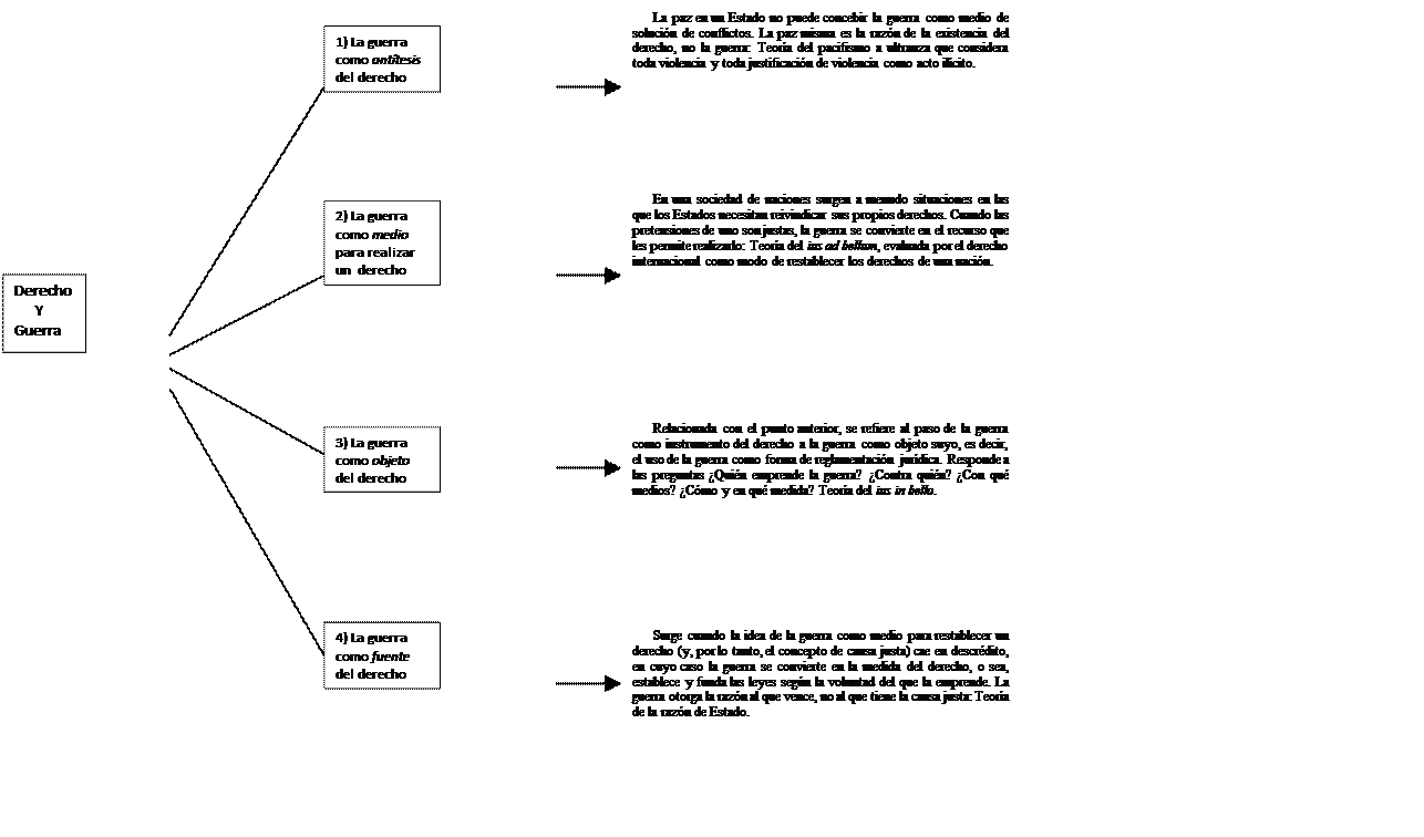 En un ensayo acerca del tratamiento de la guerra con respecto al derecho, Norberto Bobbio sostiene que hay cuatro modos de considerar esta relación (Bobbio, 1992: 95-109). En la Fig. 1 se sintetizan sus afirmaciones al respecto: