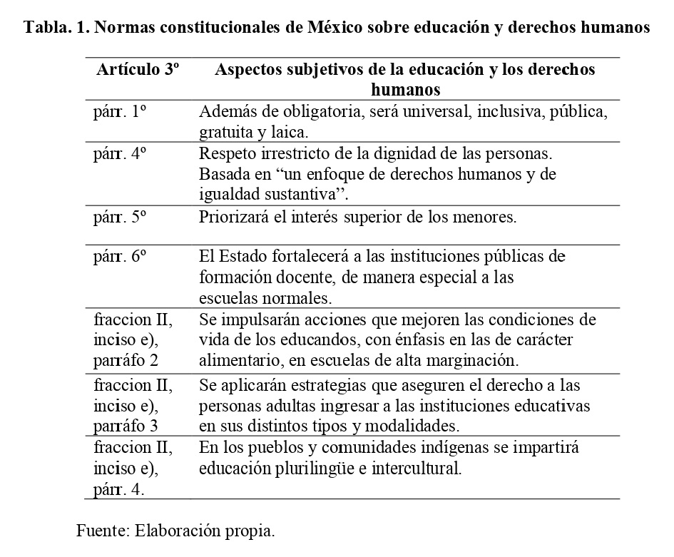 A partir de las bases de derechos humanos que surgieron en México mediante las reformas de junio de 2011 y del contenido del artículo 3º constitucional sobre el derecho a la educación y la reforma del 15 de mayo de 2019, se reconfiguró el marco del derecho a la educación y reconoció una nueva visión de la escuela mexicana, tendiente a mejorar las condiciones de vida de los educandos. Con una visión humanista centrada en la juventud mexicanas, se afirma que “se respaldará a estudiantes en vulnerabilidad social, mediante el establecimiento de políticas incluyentes y transversales (Artículo 3º constitucional, fracción II, inciso e). Por primera vez en la historia de las Escuelas Normales, desde 2019 se les inserta en el texto del artículo 3º constitucional y se afirma que “El Estado fortalecerá́ a las instituciones públicas de formación docente, de manera especial a las escuelas normales, en los términos que disponga la ley.” El reconocimiento constitucional a las normales pretende reivindicar su exclusión y es un puente de diálogo frente a las agresiones sistemáticas en contra de estudiantes de las Escuelas Normales de Tiri, Arteaga, El Mexe, y contra la Normal Raúl Isidro Burgos de Ayotzinapa (Coll, 2015: 92-94), a pesar de que siguen siendo una opción educativa para poblaciones pobres del campesinado mexicano (Civera Cerecedo, 2004: 13).