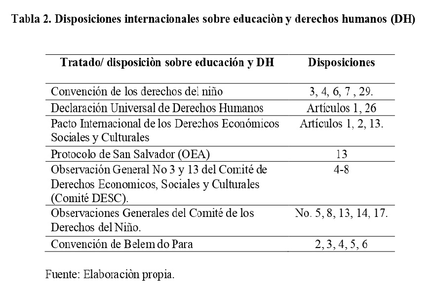 Todo el marco internacional señalado en la Tabla 2 fija los criterios específicos de la estructura, disponibilidad, accesibilidad (económica, material, sin discriminación) adaptabilidad y de contexto social sobre la educación. Bajo estas pautas, desde este marco legal internacional se reconoce el papel fundamental de la educación en el desarrollo de una sociedad con respeto la dignidad humana y que debe ser prioritaria en el caso de la niñez. Por ejemplo, el Comité de Derechos Económicos, Sociales y Culturales de la onu en su observación general número 13 establece que: (i) la educación debe orientarse al desarrollo del sentido de la dignidad de la personalidad humana, (ii) debe capacitar a todas las personas para participar efectivamente en una sociedad libre y debe favorecer la comprensión entre todos los grupos étnicos, y (iii) entre las naciones y los grupos raciales y religiosos (Comité desc, 1999: párr. 1).