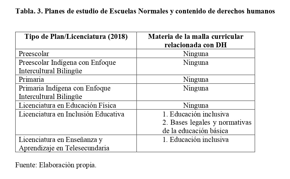 Y de acuerdo a los hallazgos, tanto de la revisión documental de los planes y las mallas curriculares de las Escuelas Normales no se contemplan de forma suficiente aspectos ni contenido de derechos humanos. En este sentido, la práctica docente seguirá careciendo de una herramienta esencial para mejorar de forma sustancial el entendimiento de conceptos como la inclusión educativa, los mecanismos de solución de conflictos escolares y el respeto a la dignidad humana.