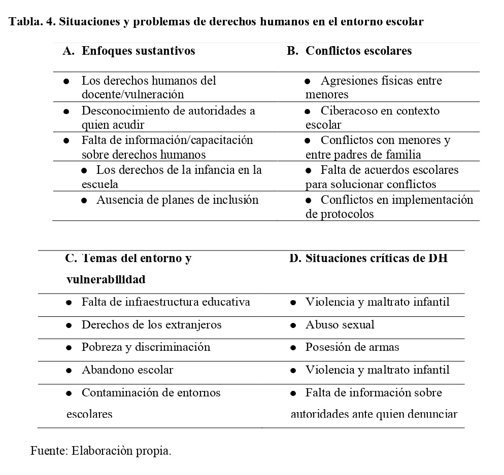 En la dinámica de preguntas y respuestas sobre casos de derechos humanos en sus actividades cotidianas que se sostuvo en tres sesiones con los grupos focales, se encontró que los problemas de derechos humanos con los que se enfrentan mayormente en su práctica docente y el contexto educativo donde se desenvuelven son principalmente los relacionados con violencia y acoso escolar. El total de las situaciones descritas por los docentes se agruparon en las siguientes categorías: A) enfoques de derechos humanos; B) Conflictos escolares; C) Temas de entorno físico y vulnerabilidad; y D) Situaciones críticas derechos humanos: