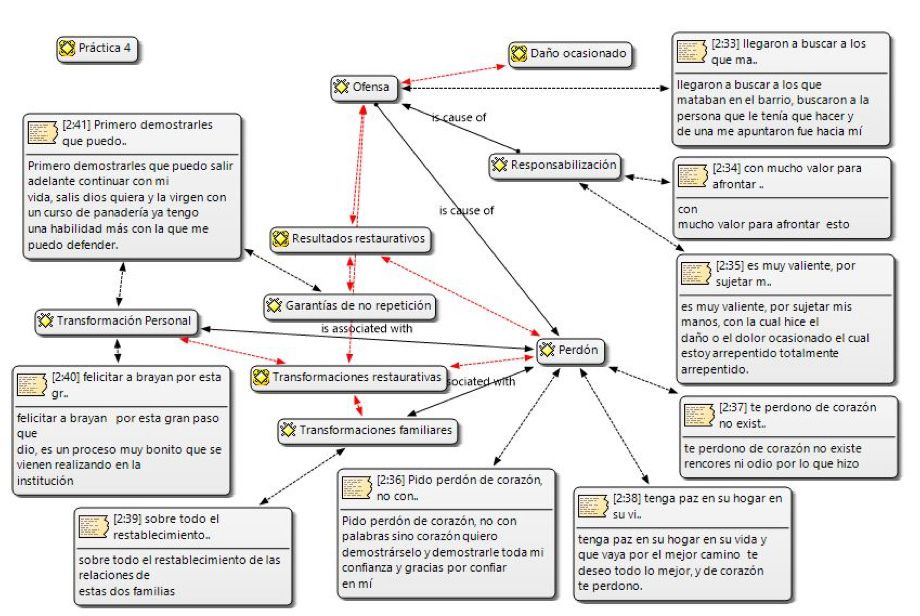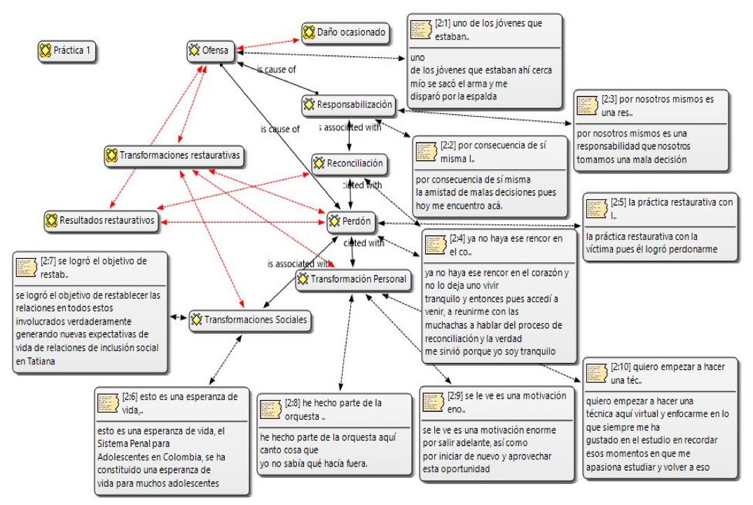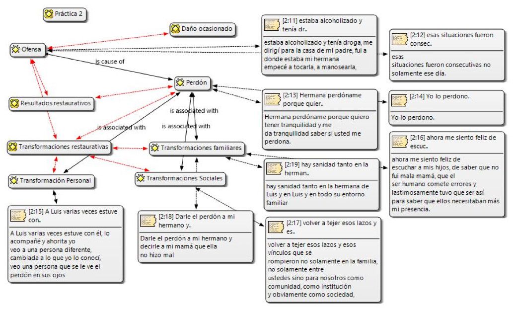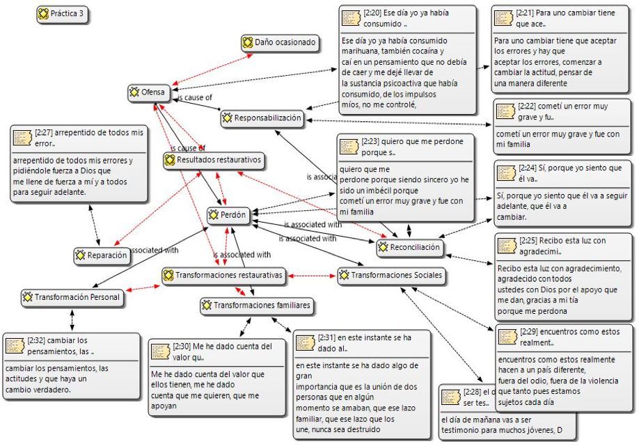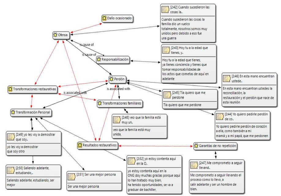 Este estudia busca comprender el dialogo entre ofensores y víctimas durante los encuentros restaurativos, mediante un objetivo general que fue analizar estos diálogos a través del software Atlas ti. Para la consecución del mismo se utilizaron los objetivos específicos: compilar los encuentros restaurativos realizados en la ONG crecer en familia de los años 2015 a 2021, categorizar la información obtenida en los diálogos entre víctimas y ofensores infractores institucionalizados en la ONG crecer en familia y relacionar las palabras y su significado en la conversación víctima-ofensor durante los encuentros restaurativos.