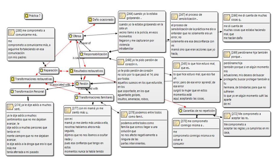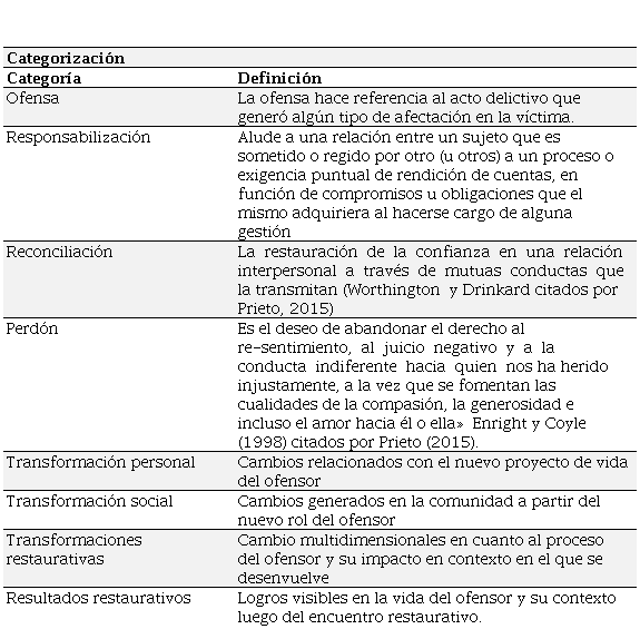 Para este proceso se ha tenido en cuenta los videos documentales de las 7 prácticas restaurativas que se han llevado a cabo en el CAE Los Patios de la ONG Crecer en Familia, en los años 2015 a 2021, los cuales fueron transcritas en su totalidad y organizadas a través de categorías de análisis (tabla 1) por el software Atlas TI, de los cuales se encontró las siguientes similitudes en los procesos restaurativos de los siete ofensores y siete víctimas participantes del proceso.