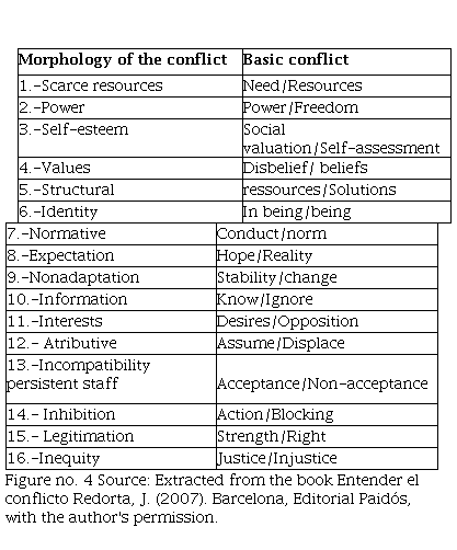 From the works of (Redorta, J. 2004, 2007 and 2011) we address the problematic issue of seeking conflicts which, by their elemental basis, could follow a pattern by itself recognizable in social life. This research led to the establishment of the following table:
