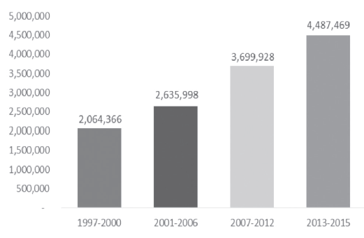 Como proporción del pib, el gasto público fue equivalente a 19.2% en 2000 y a 27.0% en 2015, por lo que se incrementó 7.8 puntos porcentuales del Presupuesto Programable (pp) en ese lapso. Esta expansión fue principalmente en el gasto público que aumentó 7.9%, con un mayor ritmo en las erogaciones corrientes de 5.0 puntos porcentuales del pp que en las de capital con 2.9%. “El gasto en pensiones y jubilaciones aumentó 2.1, y significó poco más de la cuarta parte del incremento del gasto programable” (asf, 2016: 109). En ese sentido: