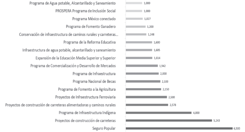 Así, el 30 de enero de 2015, se anunció un recorte presupuestal por más 124 mil millones de 265.0 millones de pesos. Pero de acuerdo con la Auditoria Superior de la Federación (asf), la información pública no permite saber qué se hizo con ese recorte aunque, gracias a los requerimientos de información de dicho organismo, se sabe que lo intacto fue el gasto corriente del gobierno federal. En contrapartida, según el Banco Mundial, la corrupción nos cuesta a los mexicanos cerca del 10% del pib, esto es alrededor de 2.2 billones de pesos anuales (Flores, 2017; Roldán, Castillo y Ureste, 2018).