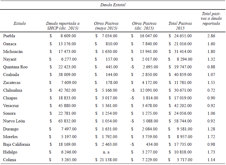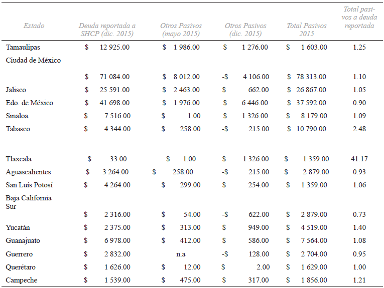 En resumen, “los pasivos totales registrados en el documento titulado Análisis del Informe de Avance de Gestión Financiera 2016, suman 50 464 millones de pesos más respecto de lo anteriormente registrado” (asf, 2016: 164). El caso más grave es el de Puebla –como ya se mencionó–; el segundo es Tabasco, su deuda ante la shcp es de 4 344 millones de pesos, pero sus pasivos totales alcanzan los 10 790 millones de pesos. El tercer caso grave es Michoacán: la deuda es de 17 473 millones, pero el total de pasivos llega a 31 414 millones de pesos. En ese orden le siguen Hidalgo, Morelos, Oaxaca, Zacatecas, Yucatán, Nayarit, Durango y Tamaulipas (véase anexo 1).