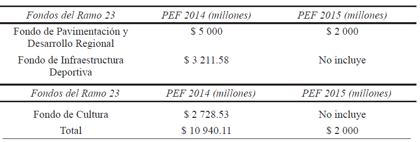 Como se observa en el cuadro 1, en el 2015 el proyecto del Ejecutivo no incluyó en los Fondos clientelares los de Infraestructura Deportiva y el Fondo de Cultura en las partidas de gastos federalizados. En el PEF 2015, el Fondo de Pavimentación y Desarrollo Regional fue menor que el aprobado un año antes, aunque se espera que aumente después de la negociación (Consejo Nacional de Evaluación de la Política de Desarrollo Social, 2015).