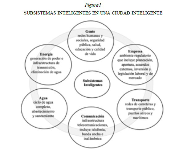 Las ciudades se basan en diversos sistemas o dimensiones de infraestructura de redes y urbana, gobernanza y medio ambiente sustentable que son centrales para lograr su operación y alcanzar las metas programadas, y en diversos subsistemas o componentes interconectados (Dirks, Keeling & Dencik, 2009: 4, 5), que deben ser vistos globalmente para entender la manera cómo se relacionan e interactúan entre sí. Estos subsistemas se conforman en los elementos clave para la constitución de una ciudad: infraestructuras en red (transporte, servicios empresariales, vivienda y diversos servicios públicos y privados); desarrollo urbano liderado por empresas medianas y grandes a través de la cooperación y consulta con el gobierno local y las comunidades; desarrollo económico a través de la creatividad que integra la tolerancia, el talento y la tecnología; el aprendizaje social, la educación y el capital social que promueve la inclusión y un medio ambiente sustentable referidos por un lado, a la cohesión social y el sentido de pertenencia, y por otro, al desarrollo urbano ecológico y ‘verde’ (Hollands, 2008: 308-310). Cuando estos subsistemas se interconectan con las tecnologías de información se da paso a sistemas inteligentes interconectados que coadyuvan a mejorar la prestación de servicios gubernamentales, sociales, humanos o empresariales, al facilitarse su realización en tiempo real. Estos subsistemas son centrales para el surgimiento, operación y desarrollo de una ciudad Inteligente y son seis: gente, empresa, transporte, comunicación, agua y energía (figura 1).