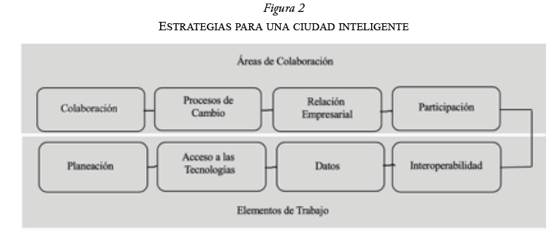 Estrategias de colaboración: Impulsar estrategias de colaboración es esencial en una ciudad Inteligente para lograr acuerdos y trabajo conjunto. Para ello es necesaria la comunicación y la colaboración entre agencias gubernamentales y no gubernamentales, universidades, empresas y ciudadanos. Las estrategias de colaboración invitan a compartir, participar y ayudar a la solución de problemas complejos en la ciudad; son clave para alcanzar resultados exitosos y acercar a personas, organizaciones, autoridades regionales y municipales para que, compartiendo conocimiento y recursos, puedan de manera eficiente y económica lograr la transformación Inteligente de una ciudad (Boorsma, Baekelmans & Bennett, 2018).