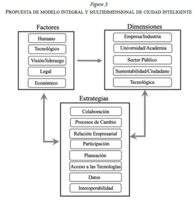 Un modelo integral debe abarcar todo lo que sea necesario para una ciudad Inteligente, por lo que se consideró importante establecer categorías e incluir en ellas los elementos que se reconoció y que son claves para el desarrollo de la ciudad Inteligente. Para ello se distingue entre dimensiones, factores y estrategias. Las dimensiones son las áreas que serán afectadas o en las cuales se deben llevar a cabo acciones; es decir, los elementos de la ciudad que se espera sean positivamente afectados por los esfuerzos e iniciativas relacionados con ciudades Inteligentes. Los factores y sus correspondientes indicadores son los recursos y capacidades de la ciudad que, al combinarse, influyen o crean las posibilidades de que la ciudad pueda lograr impactos en las dimensiones o áreas deseadas. Finalmente, las estrategias son decisiones de los gobernantes y otros actores sociales con autoridad o influencia en la ciudad. Las estrategias se refieren tanto a cómo usar los recursos y capacidades de la ciudad para lograr mejores resultados en todas las dimensiones relevantes, como a ciertos factores externos, ya que considerarlos es un paso necesario para un mejor entendimiento de la situación.