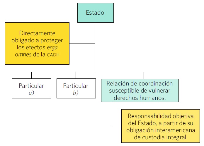 De tal manera que el análisis sobre la procedencia de la responsabilidad internacional del Estado frente a los actos que vulneren derechos humanos en las relaciones inter privados dependerá de un minucioso estudio en concreto que demuestre la omisión en el deber de custodia integral y, por ende, en la protección de los efectos erga omnes de la CADH, ante la afectación o disminución en el contenido esencial de un derecho que provoque un particular.