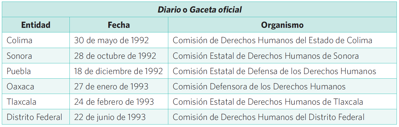 Las dos reformas constitucionales referidas en el párrafo anterior no fueron las únicas, toda vez que a la fecha se han realizado un total de cuatro reformas al artículo 102, apartado B, de la Constitución federal,12 con el fin de reconocer y fortalecer a los organismos de protección a los derechos humanos. La reforma que mayor trascendencia reviste, desde el punto de vista de la investigación, es la publicada el 28 de enero de 1992, que da lugar a la existencia de organismos estatales de protección a los derechos humanos, un proceso que no fue inmediato, ya que paulatinamente fueron surgiendo estos organismos en cada una de las entidades federativas. En el siguiente cuadro se observan algunos casos que ejemplifican lo expresado.