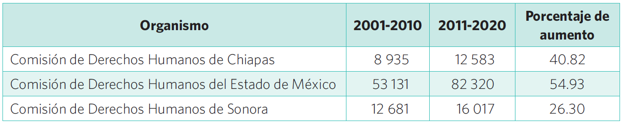 La Comisión de Derechos Humanos de la Ciudad de México (CDHCM) –antes del Distrito Federal–, en el periodo de 2001 a 2010 registró un total de 75 634 quejas y de 2011 a 2020 un total de 86 279, el incremento fue de 14.07%. Veamos a continuación otros casos.