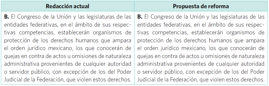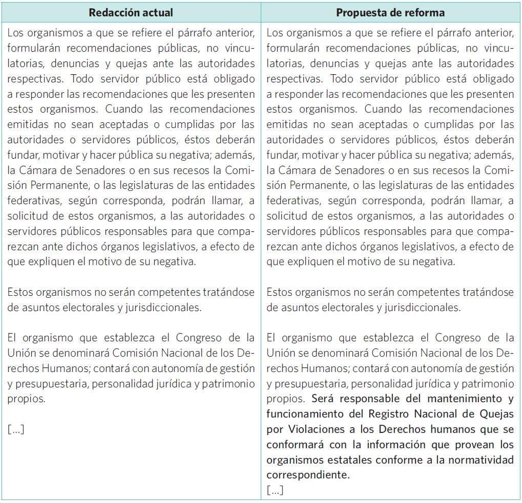 En este orden de ideas, resultaría necesaria una reforma constitucional al artículo 102, apartado B, de la Constitución Política federal para que se torne como una obligación de los organismos el proveer de la información necesaria para su funcionamiento. Así, también se generaría el compromiso para la Cámara de Diputados de otorgar los recursos específicos para la creación, puesta en marcha y mantenimiento del multicitado Registro a partir de una partida presupuestal etiquetada. A continuación se presenta una propuesta de redacción y reforma: