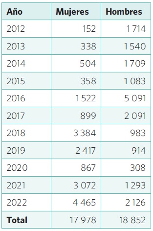Como se desarrollará más adelante, la importancia de la prestación de servicios de salud sexual y reproductiva surge, a su vez, del periodo de tiempo que las personas pasan detenidas en los centros del INM, pues al estar en detención las personas no pueden acudir de manera directa por insumos de salud, por poner un ejemplo. En este sentido, se solicitó al Instituto que informara el número de personas que estuvieron detenidas por más de 15 días en la estación migratoria de la capital del país entre 2012 y 2022.