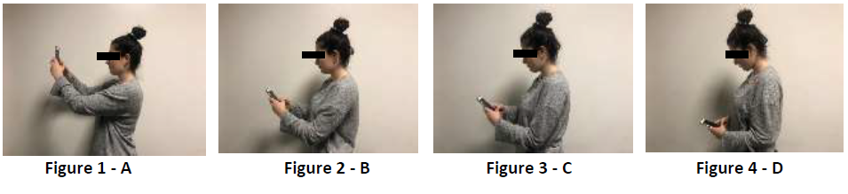 Analytical cross-sectional study, where participation was voluntary, using a non-probability convenience sampling technique. Of the 320 potentially eligible students, two participants were excluded from the sample because they didn’t own a smartphone and they failed to complete the assessment tools used correctly, namely the socio-demographic questionnaire. The final sample consisted of 318 students enrolled and attending higher education in the school year 2018/2019 at Escola Superior de Saúde Vale do Sousa – CESPU. Firstly, we have asked for permission to carry out the study from the Ethics Committee of the Institution. Such permission was granted under the number 25/CE-IUCS/2018. All the volunteers received an informed consent under the Helsinki model, and the anonymity and confidentiality of data was guaranteed. The survey conducted for this study consisted of multiple choice and short answer questions, with the purpose of characterizing the sample. Thus, the survey was divided into three groups, (1) sociodemographic characteristics, (2) psychosocial and physical factors on the use of smartphone, (3) questions about musculoskeletal symptoms. For the purpose of the study, it was necessary to understand the knowledge and self- awareness of the cervical posture adopted when using the smartphone. Therefore, based on the article published by Hansraj, (2014) e Damasceno et al. (2018), we have captured images for this very purpose. The images captured portray four different cervical postures during the use of the smartphone: