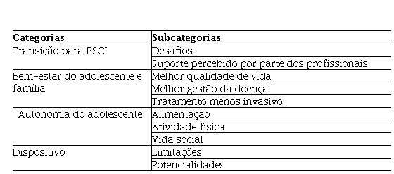 Da análise dos discursos relativos à perceção das mães sobre a utilização dos sistemas de perfusão contínua de insulina no tratamento da DM1 dos adolescentes, emergiram quatro categorias: A TRANSIÇÃO PARA PSCI, BEM-ESTAR DO ADOLESCENTE E FAMÍLIA, AUTONOMIA DO ADOLESCENTE e LIMITAÇÕES DO DISPOSITIVO. As categorias resultaram de uma agregação semântica, tendo por base a relação entre as subcategorias e as unidades de registo.